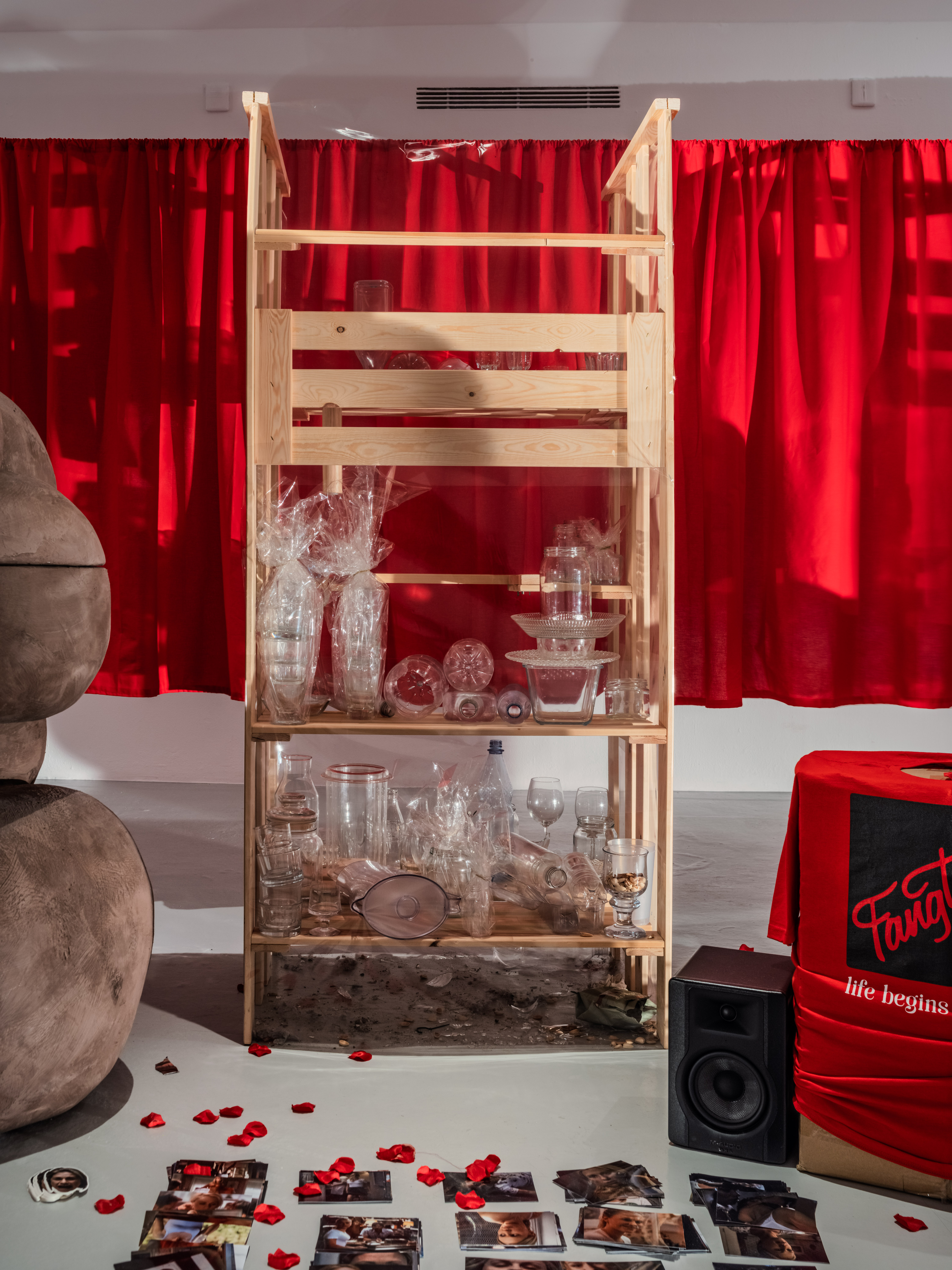 Two readymade bookshelves from Bygghemma, dust, found glass and plasticware, pistachio nut shells and bag, cellophane wrapping, broken glass, synthetic rose petals