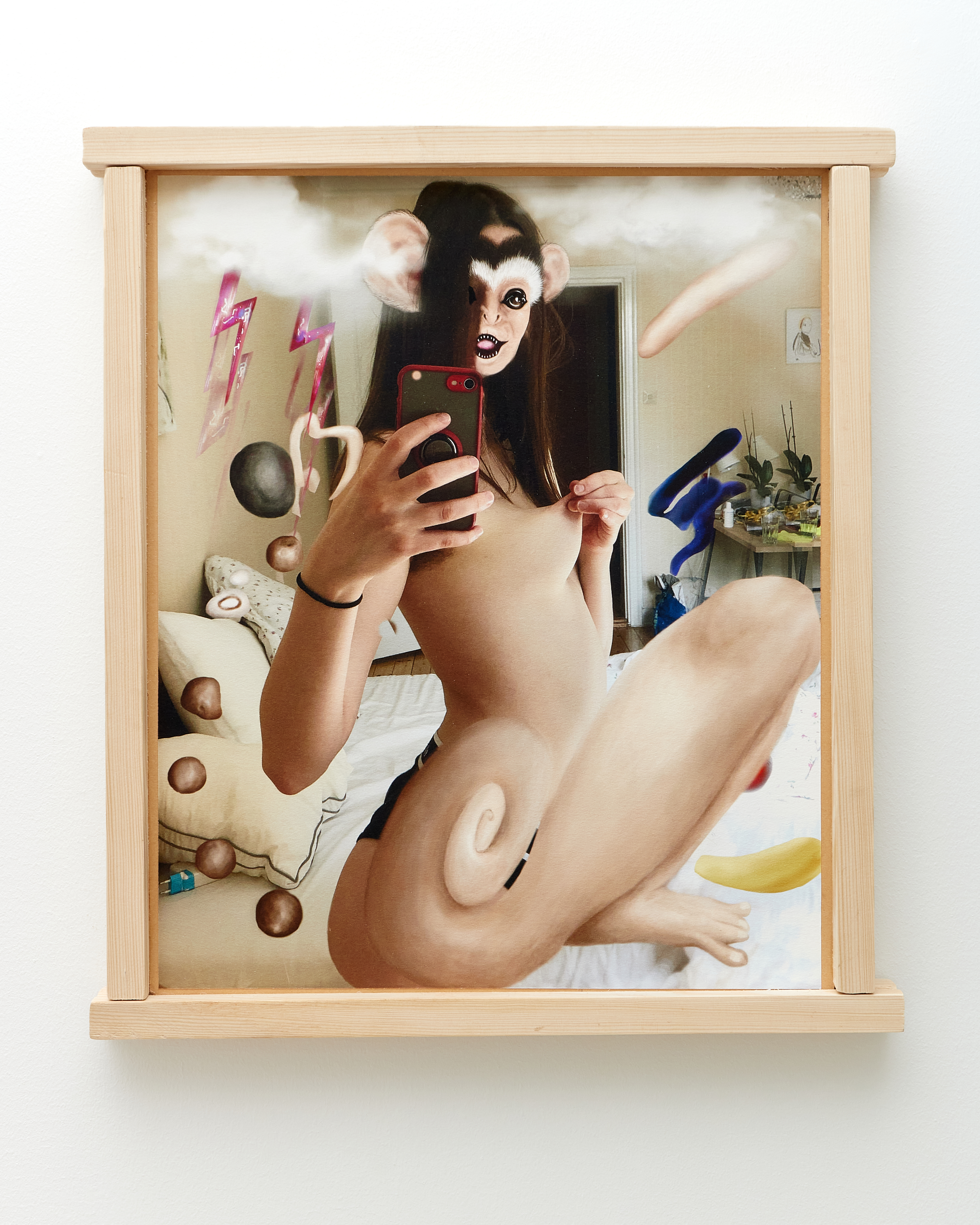 Digital drawing on photograph, giclee print, wire, dry pastels on canvas, sewing thread, glue.